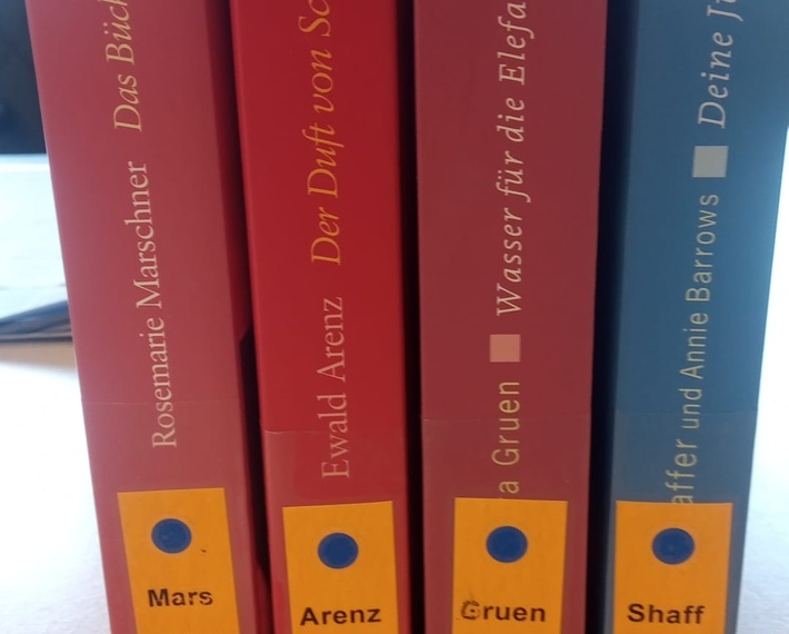 Diese Bücher sind alphabetisch sortiert und mit einem blauen Punkt gekennzeichnet.